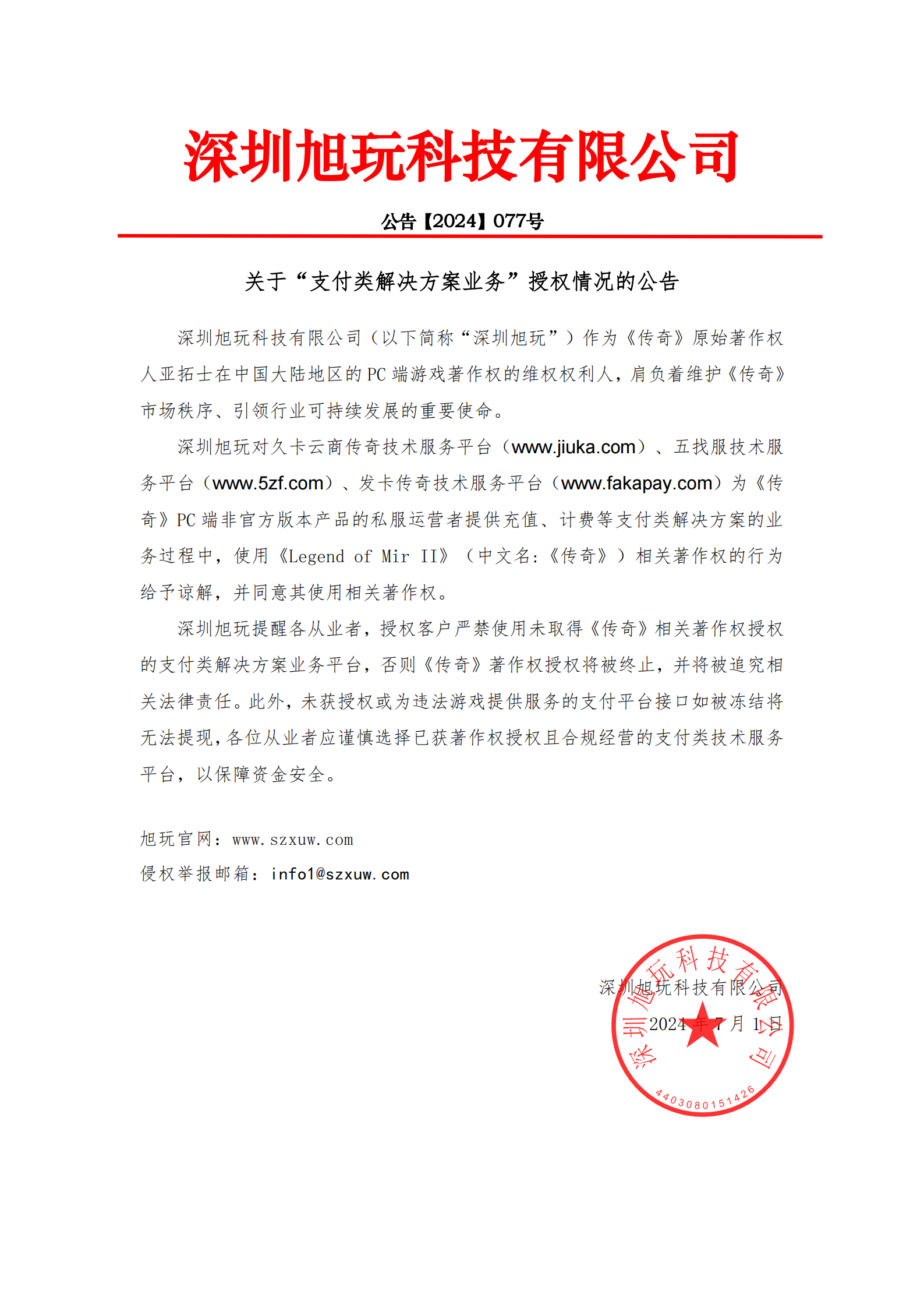 深圳旭玩提醒各从业者,授权客户严禁使用未取得《传奇》相关著作权授权的支付类解决方案业务平台,否则《传奇》著作权授权将被终止,并将被追究相关法律责任。此外,未获授权或为*游戏提供服务的支付平台接口如被冻结将无法*,各位从业者应谨慎选择已获著作权授权且合规经营的支付类技术服务平台,以保障资金安全。