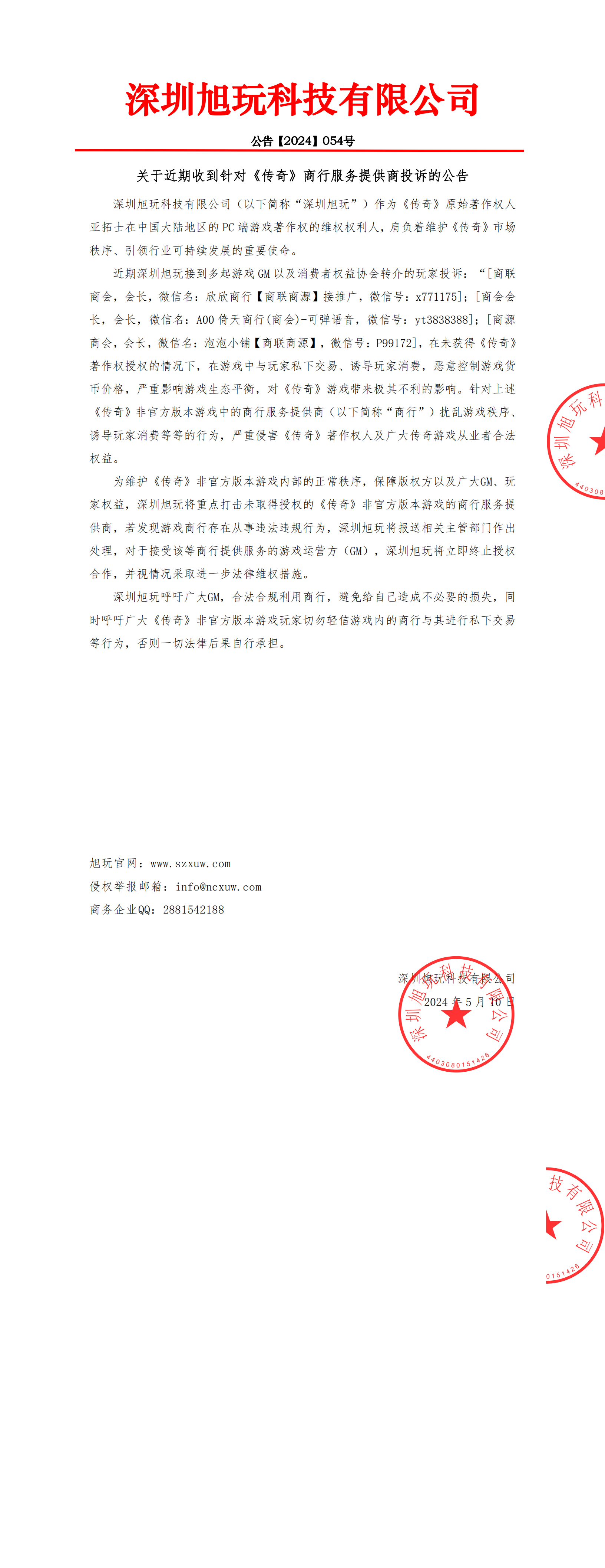 近期深圳旭玩接到多起游戏GM以及消费者权益协会转介的玩家投诉:“[商联商会,会长,微信名:欣欣商行【商联商源】接推广,微信号:x771175];[商会会长,会长,微信名:A00倚天商行(商会)-可弹语音,微信号:yt3838388];[商源商会,会长,微信名:泡泡小铺【商联商源】,微信号:P99172],在未获得《传奇》著作权授权的情况下,在游戏中与玩家私下交易、诱导玩家消费,恶意控制游戏货币价格,严重影响游戏生态平衡,对《传奇》游戏带来极其不利的影响。针对上述《传奇》非官方版本游戏中的商行服务提供商(以下简称“商行”)扰乱游戏秩序、诱导玩家消费等等的行为,严重侵害《传奇》著作权人及广大传奇游戏从业者合法权益。