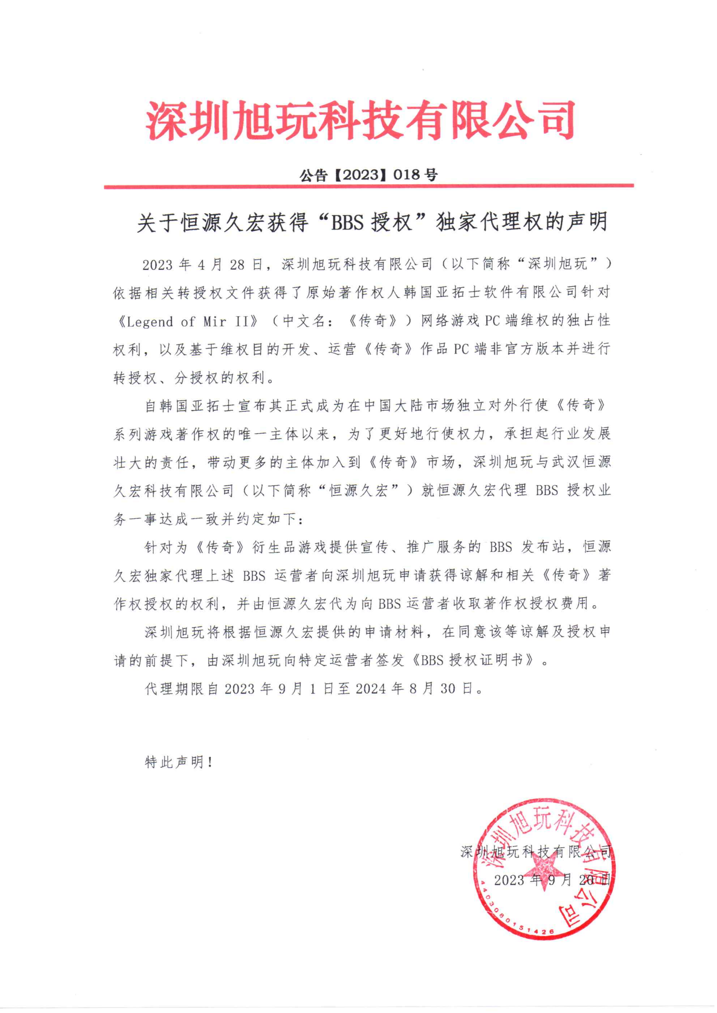 自韩国亚拓士宣布其正式成为在中国大陆市场独立对外行使《传奇》系列游戏著作权的唯一主体以来,为了更好地行使权力,承担起行业发展壮大的责任,带动更多的主体加入到《传奇》市场,深圳旭玩与武汉恒源久宏科技有限公司(以下简称“恒源久宏”)就恒源久宏代理BBS授权业务一事达成一致并约定如下: