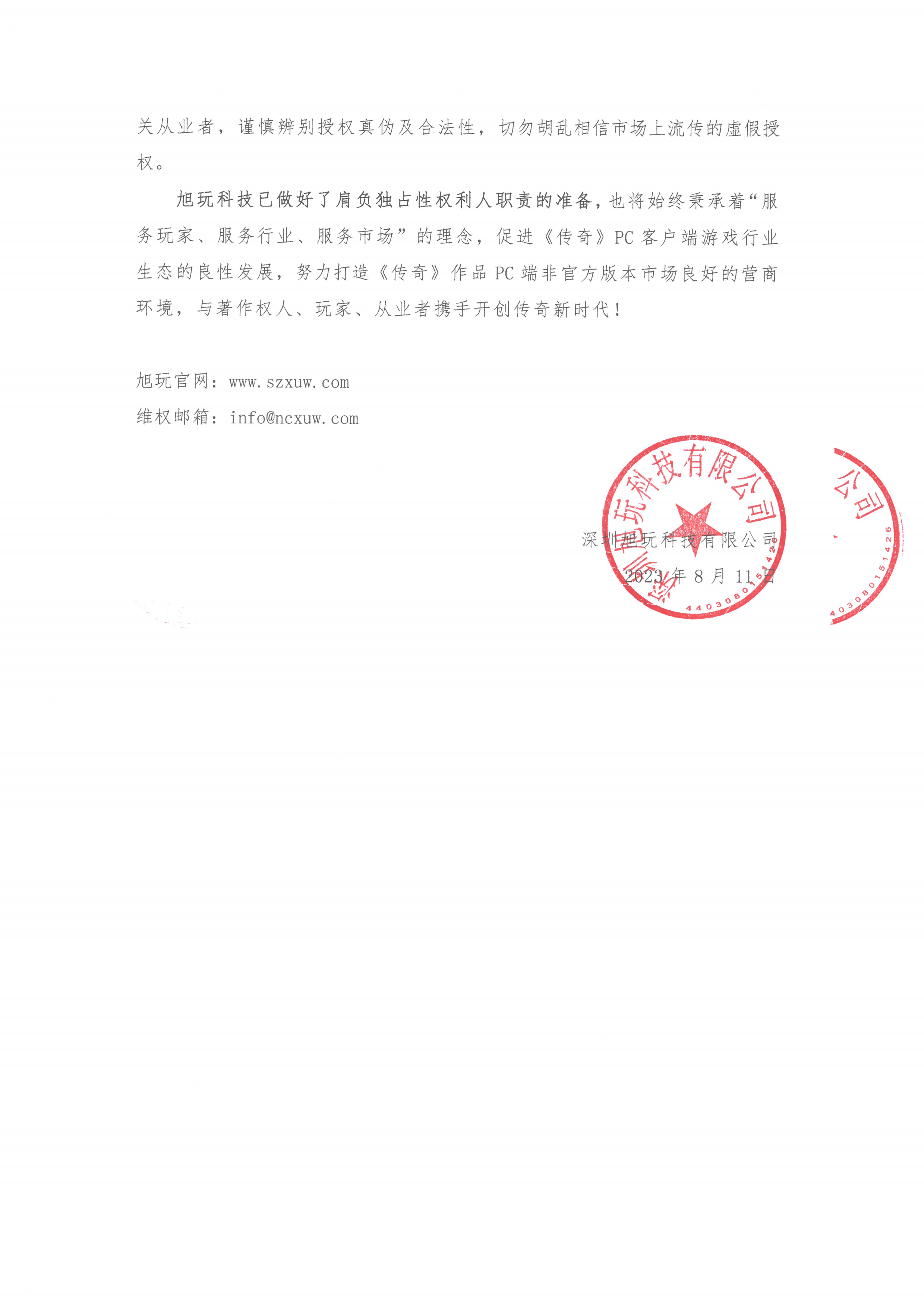 旭玩科技已做好了肩负独占性权利人职责的准备,也将始终秉承着“服务玩家、服务行业、服务市场”的理念,促进《传奇》PC客户端游戏行业生态的良性发展,努力打造《传奇》作品PC端非官方版本市场良好的营商环境,与著作权人、玩家、从业者携手开创传奇新时代!