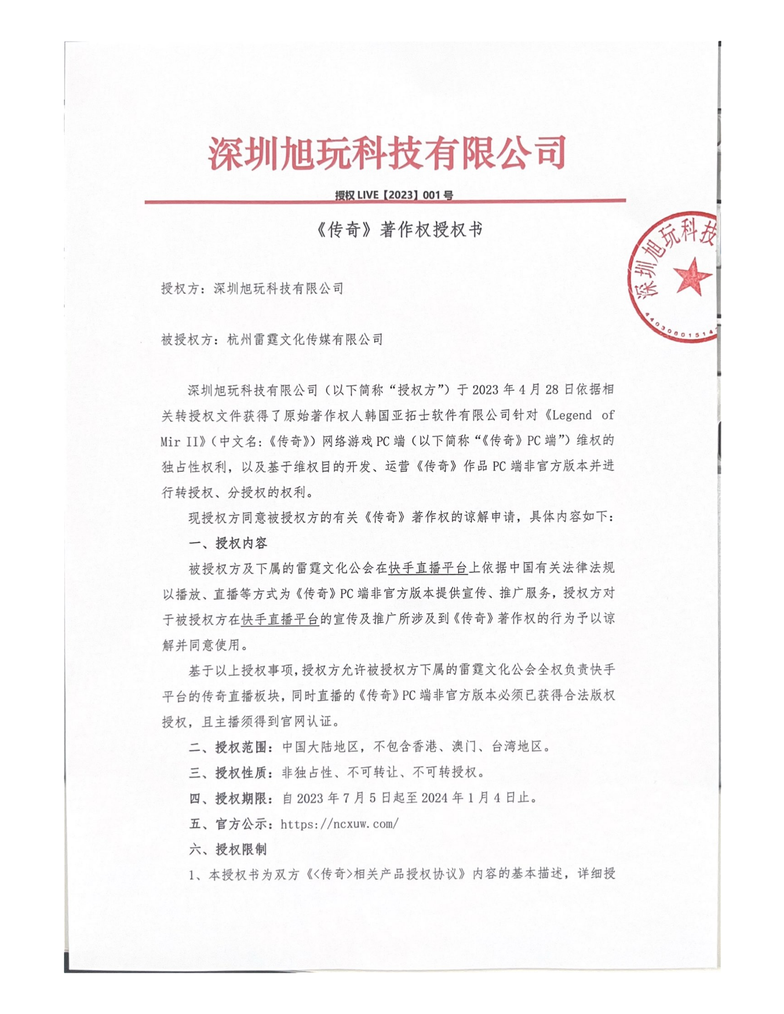 官方公示:杭州雷霆文化取得深圳旭玩《传奇》直播授权书