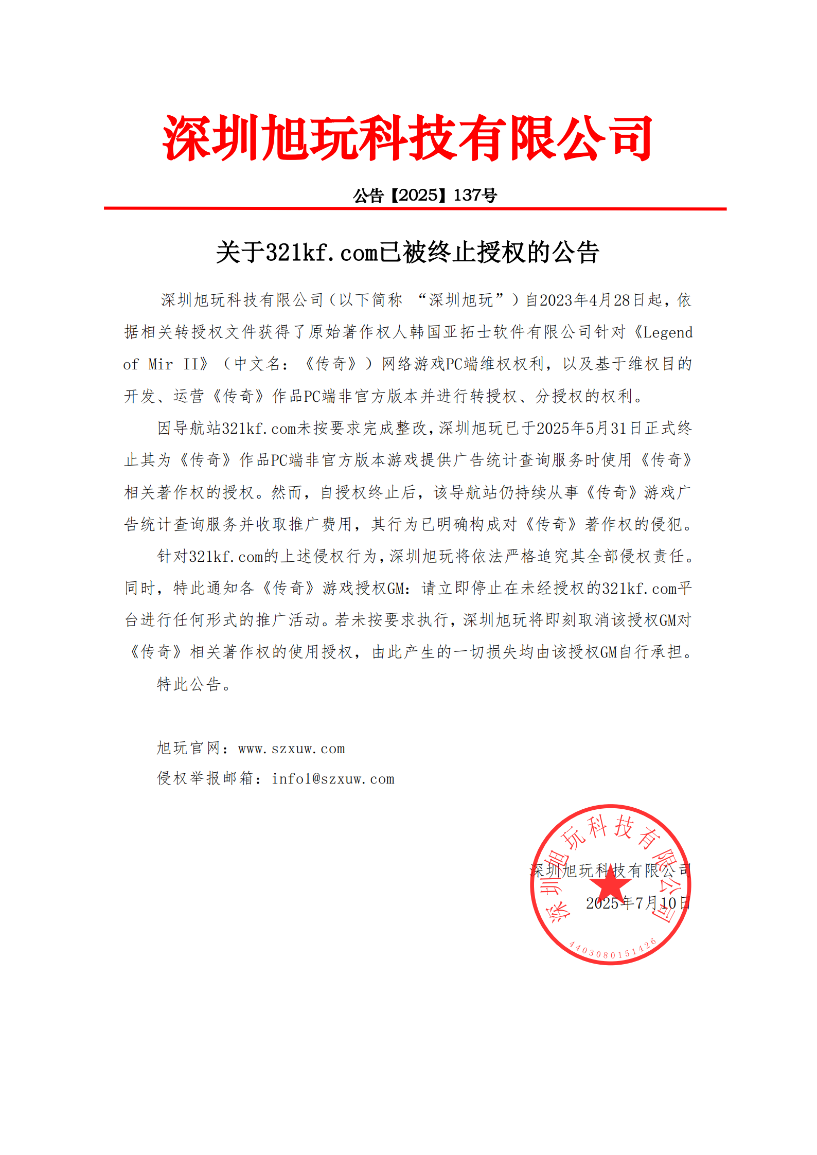 针对321kf.com的上述侵权行为,深圳旭玩将依法严格追究其全部侵权责任。同时,特此通知各《传奇》游戏授权GM:请立即停止在未经授权的321kf.com平台进行任何形式的推广活动。若未按要求执行,深圳旭玩将即刻取消该授权GM对《传奇》相关著作权的使用授权,由此产生的一切损失均由该授权GM自行承担。