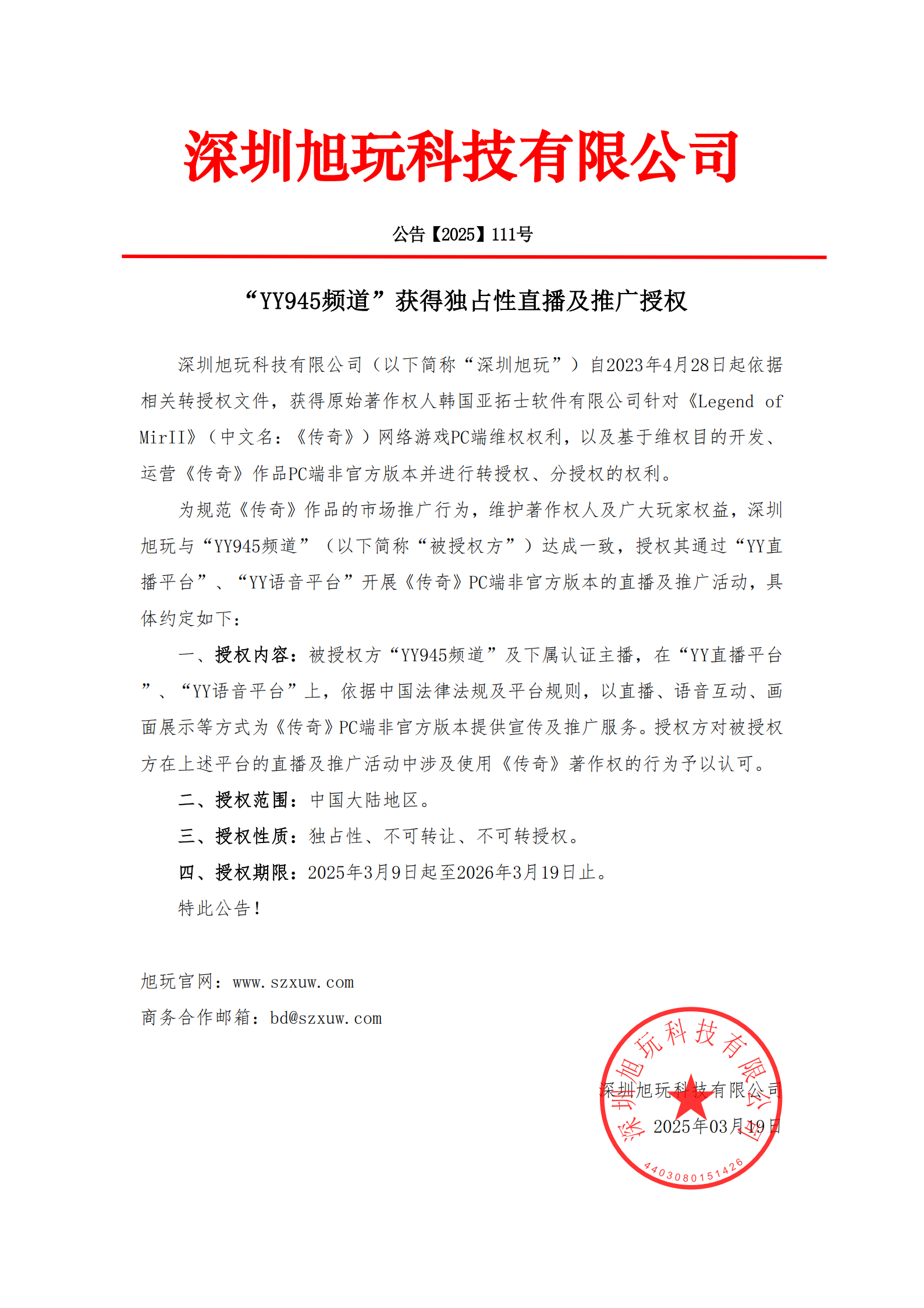 为规范《传奇》作品的市场推广行为,维护著作权人及广大玩家权益,深圳旭玩与“YY945频道”(以下简称“被授权方”)达成一致,授权其通过“YY直播平台”、“YY语音平台”开展《传奇》PC端非官方版本的直播及推广活动,具体约定如下:
